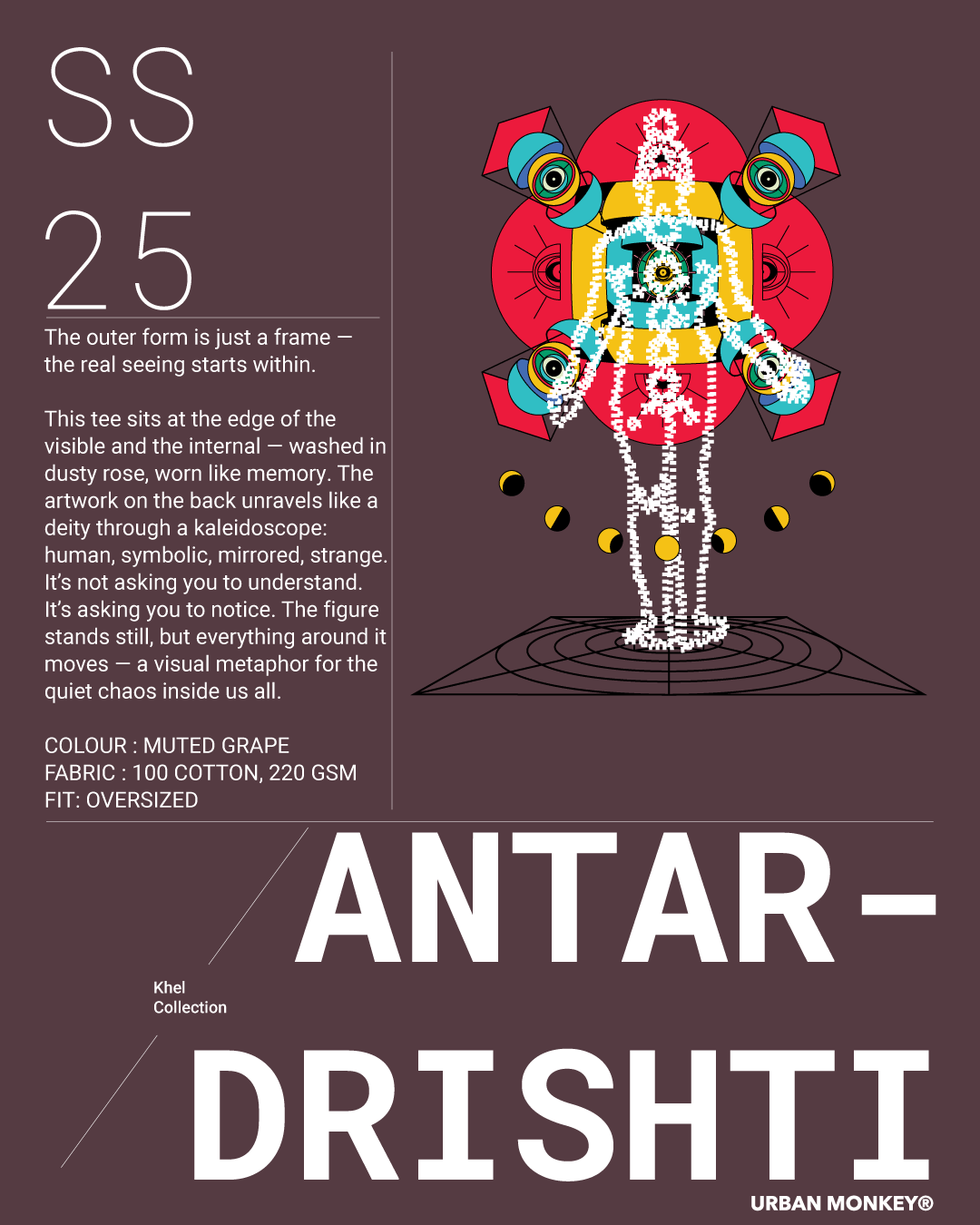 The outer form is a frame. The real seeing begins within. This tee sits at the edge of the visible and the internal — washed in dusty rose, worn like memory. The artwork on the back unravels like a deity through a kaleidoscope: human, symbolic, mirrored, strange. It’s not asking you to understand. It’s asking you to notice. The figure stands still, but everything around it moves — a visual metaphor for the quiet chaos inside us all.