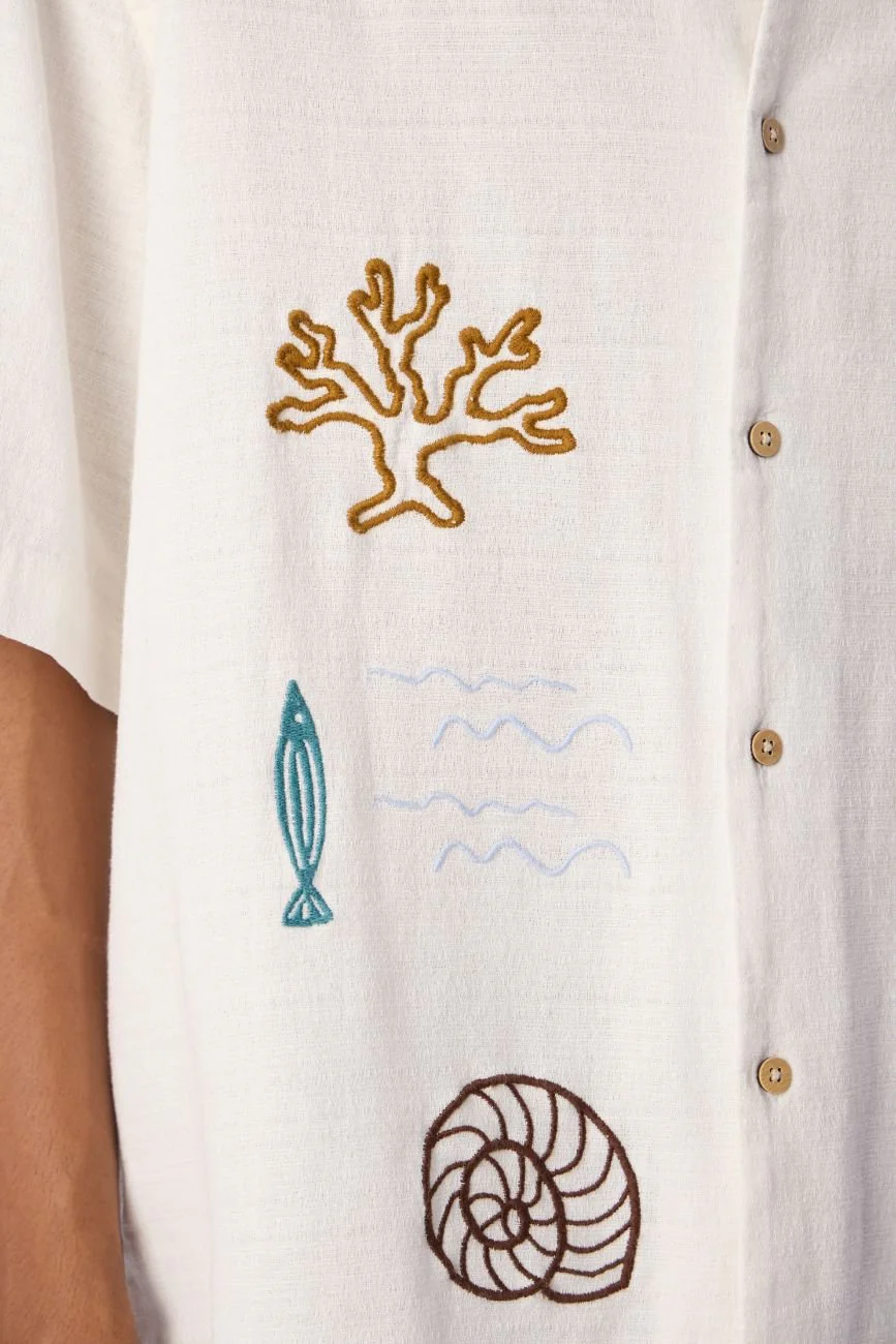 This shirt brings the shoreline to your wardrobe. Cut in an airy, oversized silhouette from textured cotton gauze, it features ocean-inspired embroidery on the front — from shells to starfish and everything in between. The resort collar and drop shoulders dial up the ease, while side slits and twin woven labels add subtle utility. Lightweight, breathable, and built to drift effortlessly from coastlines to city streets.